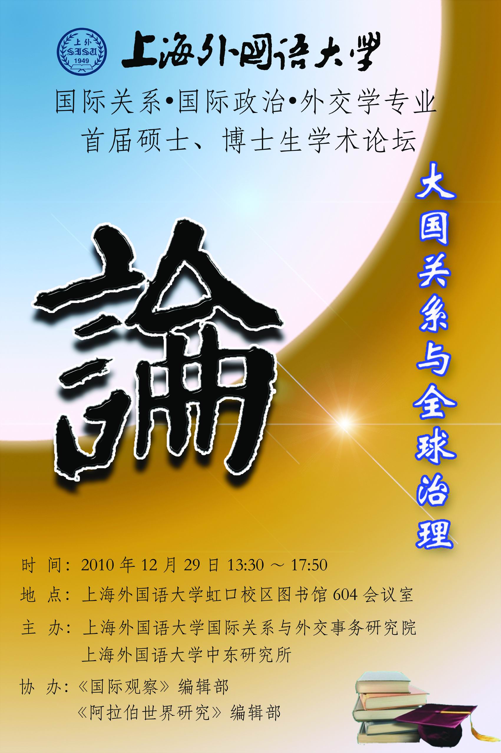 上海外国语大学 国际关系・国际政治・外交学专业 首届硕士、博士生学术论坛 “大国关系与全球治理”研讨会会议议程 主 办:上海外国语大学国际关系与外交事务研究院 上海外国语大学中东研究所 协 办:《国际观察》编辑部、《阿拉伯世界研究》编辑部 时 间:2010年12月29日13:30~17:50 地 点:上海外国语大学虹口校区图书馆604会议室 开幕式 13:30-13:35 主持人:赵伟明 (教授、博导,上海外国语大学中亚研究中心主任) 13:30-13:35 主持人介绍出席嘉宾及宣布开幕 开幕致辞 13:35-13:55 张曙光 (教授、博导,上海外国语大学副校长) 朱威烈 (教授、博导,上海外国语大学中东所所长) 胡礼忠 (教授、博导,上海外国语大学图书馆馆长) 汪小玲 (教授,上海外国语大学研究生部主任) 第一单元 13:55-15:10 议 题:全球治理困境 主持人:闵捷 (上外国际关系与外交事务研究院2009级硕士研究生) 13:55-14:05 题目:共有知识转变与全球气候治理的困境 发言人:龙菲 (上外国际关系与外交事务研究院2010级硕士研究生) 14:05-14:15 题目:全球气候治理的集体行动难题:一种经济学视角 发言人:邵雪婷 (上外国际关系与外交事务研究院2009级硕士研究生) 14:15-14:25 题目:从全球治理的五要素看北极地区机制建设的困境 发言人:潘寅茹 (上外国际关系与外交事务研究院2009级硕士研究生) 14:25-14:35 题目:从制度有效性看新兴国家参与全球环境治理 发言人:韦进深 (上外国际关系与外交事务研究院2010级博士研究生) 14:35-15:05 点评与讨论 14:35-14:43 点评人一:汪卫华 (上外法学院讲师) 14:43-14:51 点评人二:王联合 (上外国际关系与外交事务研究院副研究员) 14:51-15:05 讨论 15:05-15:20 茶歇与合影 第二单元 15:20-16:25 议题: 大国与全球治理 主持人:龙菲 (上外国际关系与外交事务研究院2010级硕士研究生) 15:20-15:30 题目:齿轮式互动:中国周边外交新动向述评 发言人:张鹏 (上外国际关系与外交事务研究院2010级博士研究生) 15:30-15:40 题目:美国直接对外投资的利益保护:以双边投资协定为例 发言人:吉小雨 (上外国际关系与外交事务研究院2009级硕士研究生) 15:40-15:50 题目:公众舆论与中国外交 发言人:周家安 (上外国际关系与外交事务研究院2010级硕士研究生) 15:50-16:00 题目:试驳“主权财富基金威胁论” 发言人:李蕊 (上外国际关系与外交事务研究院2009级博士研究生) 16:00-16:30 点评与讨论 16:00-16:08 点评人一:孙德刚 (上外中东所副研究员) 16:08-16:16 点评人二: 熊文驰 (上外国际关系与外交事务研究院助理研究员) 16:16-16:30 讨论 第三单元 16:30-17:35 议题:全球治理的制度与视角 主持人:张鹏 (上外国际关系与外交事务研究院2010级博士研究生) 16:30-16:40 题目:全球治理的组织化 发言人:李桂想 (上外国际关系与外交事务研究院2010级硕士研究生) 16:40-16:50 题目:国际公共产品的东西方差异:比较东方的“朝贡体系论”和西方的“霸权稳定论” 发言人:刘晨 (上外国际关系与外交事务研究院2009级硕士研究生) 16:50-17:00 题目:从沙特参与G20机制建设看沙特的全球治理观 发言人:田艺琼 (上外国际关系与外交事务研究院2010级硕士研究生) 17:00-17:10 题目:东亚共同体的构建及其对全球治理格局的影响 发言人:杨帆 (上外国际关系与外交事务研究院2010级硕士研究生) 17:10-17:35 点评与讨论 17:10-17:18 点评人一:钮松 (上外中东所助理研究员) 17:18-17:26 点评人二:朱杰进 (上外国际关系与外交事务研究院助理研究员) 17:26-17:35 讨论 17:35-17:45 颁奖仪式 颁奖老师: 汪宁 (教授、博导,上外国际关系与外交事务研究院) 武心波 (副教授,上外国际关系与外交事务研究院支部书记) 戴启秀 (副教授,上外国际关系与外交事务研究院副院长) 17:45-17:50 会议总结:苏长和 (教授,上海外国语大学国际关系与外交事务研究院院长) ◄ 研讨会结束 ►