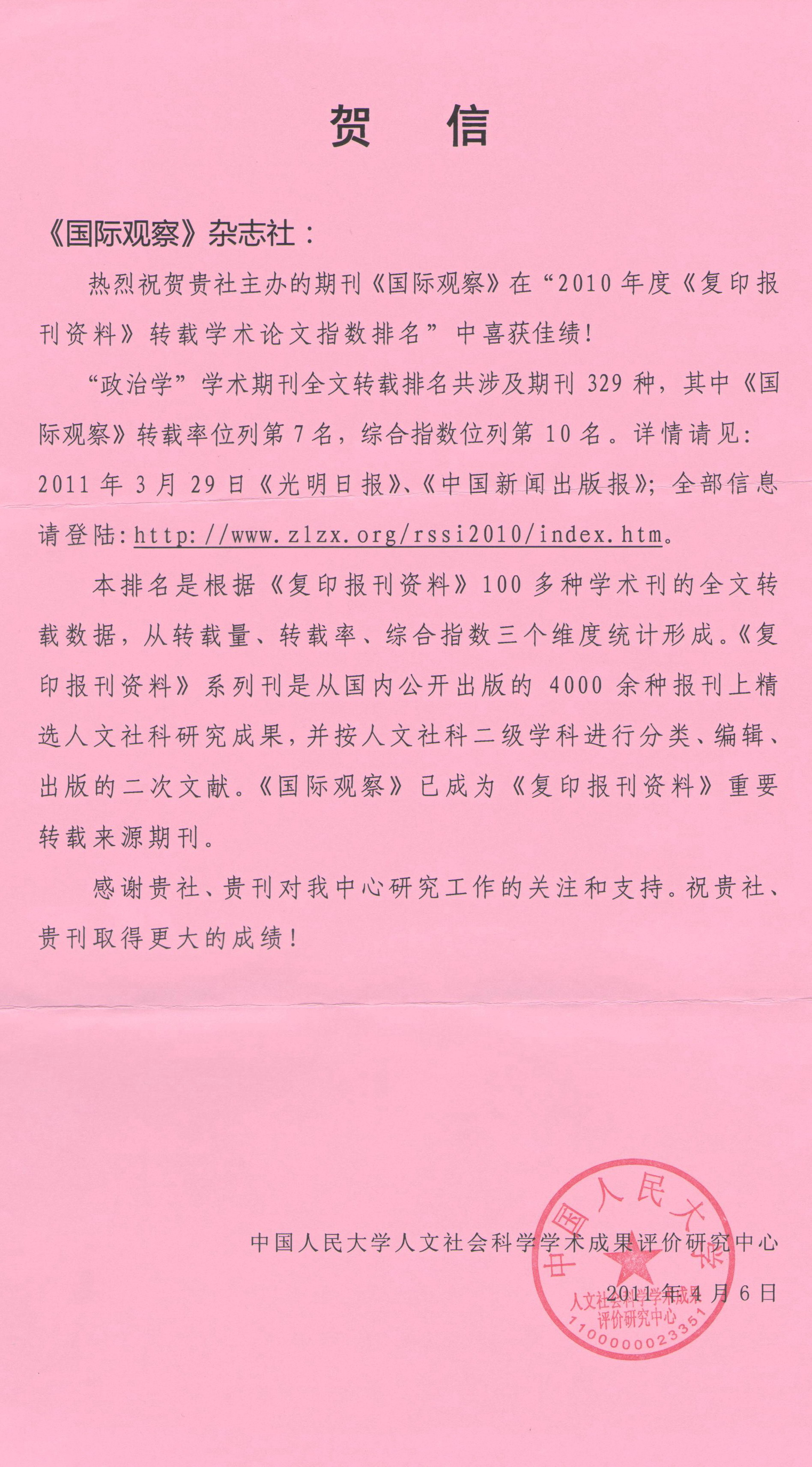 人大社科中心来函祝贺《国际观察》喜获佳绩(2011年4月贺信照片)