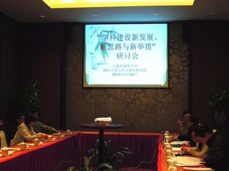 王有勇处长详细通报了教育部国际司区域和国别研究培育基地第一次工作会议内容、教育部社科司新增社科研究重点基地的建设计划、教育部和财政部的《高等学校创新能力提升计划》(简称“2011计划”)、全国重点学术期刊评选工作情况、上海高校知识服务能力平台建设计划、上海市一流学科建设计划、IPE(国际政治经济)学术年会和上海市社会科学界第十届学术年会――“世界经济、国际政治、国际关系”学科专场的筹备情况。他认为,文化大发展大繁荣为高校哲学社会科学的进一步发展创造了难得的历史机遇,也为我校政治学一级学科的进一步发展吹来了和煦的春风,注入了强大的动力。因此,我校国关院应充分调动自身的学术资源,充分发挥自身的学术潜能,充分利用我校“多语种、跨文化和跨学科”的传统优势,在教育部和上海市所搭建的各类研究基地和学术平台中,努力实现政治学与外国语言文学两大一级学科的交叉融合,为政治学的未来发展开拓全新的空间,为政治学在秋季结出累累硕果奠定坚实的基础。