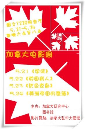 “加拿大电影周”( 为增进我校学生对于加拿大人文历史的了解,加拿大研究中心和校图书馆即将在松江校区举办一次“加拿大电影周”活动,本次活动影片由加拿大驻华大使馆赞助。 本次电影周活动的影片内容丰富,题材涉及加拿大西部开发历史、加拿大本土生活风情等,是一次不可多得的近距离接触加拿大的机会。 时间:6:00-8:00PM( 5月21日-24日)
