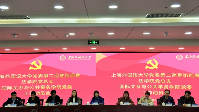2021年3月30日,上海外国语大学党委第二巡察组巡察法学院党总支、国际关系与公共事务学院党委工作动员会召开。校党委副书记、纪委书记、巡察工作领导小组副组长钱玲出席并讲话。巡察组组长王雪梅作动员讲话。法学院党总支书记李亚萍、国际关系与公共事务学院党委书记张绍铎作表态发言。法学院院长张海斌、国际关系与公共事务学院院长郭树勇作简要表态。张海斌主持会议。党委巡察工作办公室主任姚君君、巡察组副组长刘飞、张鹏及巡察组全体成员出席会议,法学院和国际关系与公共事务学院领导班子成员参加会议。法学院党总支委员、纪检委员、党支部书记、教研室主任、学科带头人、学术委员会委员、党代会代表、教代会代表、工会委员、教师和学生代表列席会议。国际关系与公共事务学院党委委员、纪检委员、党支部书记、教研室主任、学科带头人、学位评定分委员会委员、党代会代表、教代会代表、工会委员、教师学生代表列席会议。