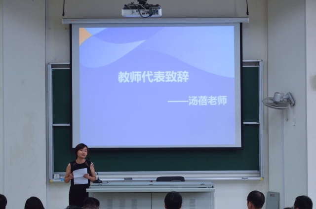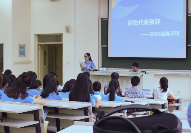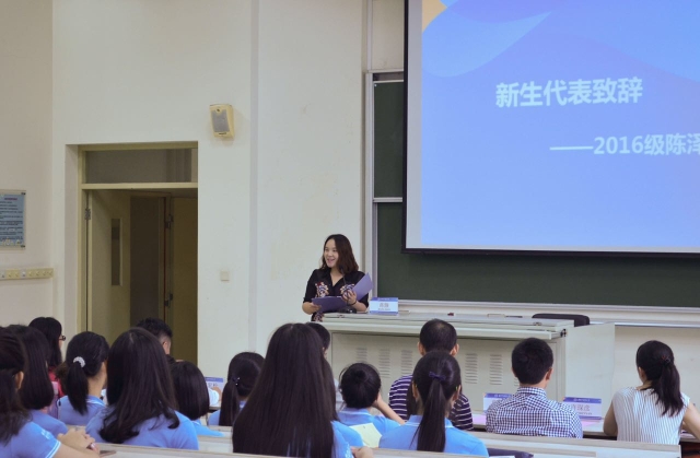 2016级新生代表陈泽琦同学发言。她对大学生活特别期待,认为大学是人生中的一个新阶段,也是新的挑战。梦想的奇伟,瑰怪,非常之观,常在于险远,非有志者不能至也。要从自身做起,通过让改变自己以改变世界。