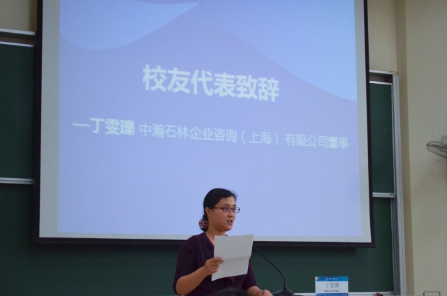 校友代表中瀚石林企业咨询(上海)有限公司董事丁雯瓅与同学们分享交流她的学习工作经验,并向新生传递一种理念,努力终会有收获,“让明天的你一定会感谢自己今天的付出”。