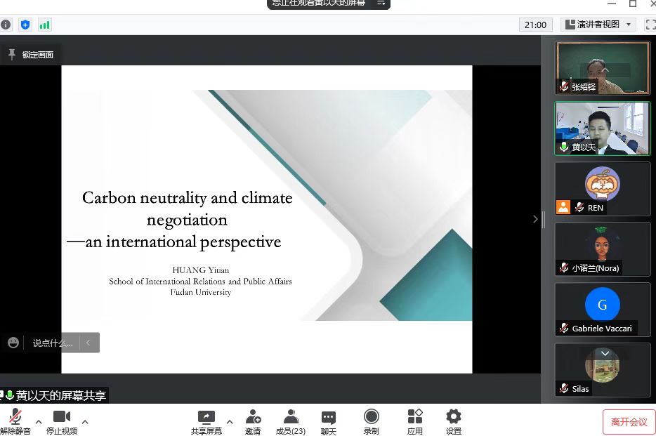 4月18日晚,复旦大学国际关系与公共事务学院的黄以天老师光临“昭明德”全英文系列活动第二场,为中外师生带来题为“碳中和及气候谈判”的线上讲座。讲座从国际角度出发,讨论了碳中和与气候谈判的历史成果、当下举措和未来可能性。