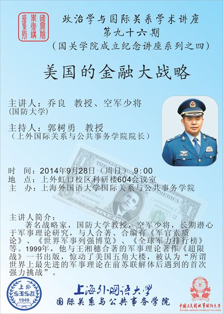 报告人简介:著名战略家,国防大学教学,空军少将,长期潜心于军事理论研究,与人合著、合编有《军官素质论》、《世界军事列强博览》、《全球军力排行榜》等。1999年,他与王湘穗合著的军事理论著作《超限战》一书出版,惊动了美国五角大楼,被认为“所谓世界上最先进的军事理论在前苏联解体后遇到的首次强力挑战”。