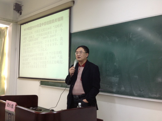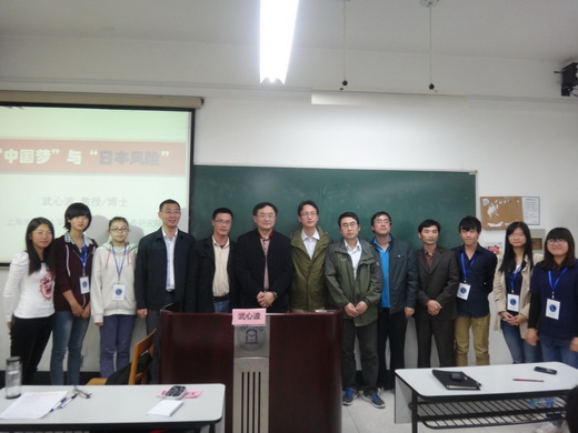 2013年11月8日,上海外国语大学国际关系与外交事务研究院常务副院长、上海外贸大学兼职教授武心波应邀,为上海外贸大学国政专业学生做了题为“‘中国梦’与‘日本风险’”的精彩演讲。