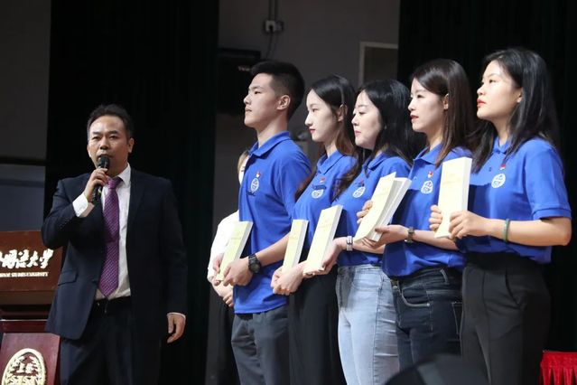 党委书记张绍铎为新生党员代表赠送党徽和《习近平新时代中国特色社会主义思想三十讲》并寄语。他回顾了国史党史上的三个时间段,鼓励同学们践行院训。第一,90年前的今天发生震惊中外的“九一八”事变,面对日寇铁蹄,一寸山河一寸血,中华儿女共赴国难,彰显爱国之情。第二,大约50年前,大批城市青年到农村插队,与农民朝夕相伴,就像《习近平的七年知青岁月》所描绘的那样,扎根中国大地。这段历史告诉我们,不论“致公”还是“为国”,都要深入了解中国国情。第三,现在距10月25日还有1个多月,1971年10月25日,中国恢复在联合国的合法席位。同学们要树立参与全球治理的意识,通过参加模拟联合国大会等活动锻炼自我,志存高远,以天下为己任,为人类命运共同体的建设贡献力量。心怀祖国,心系人民,走向世界,是每一位青年学子尤其是共产党员的责任所在。