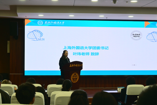 上海外国语大学团委书记宣读中国联合国协会致上海模拟联合国大会的贺信