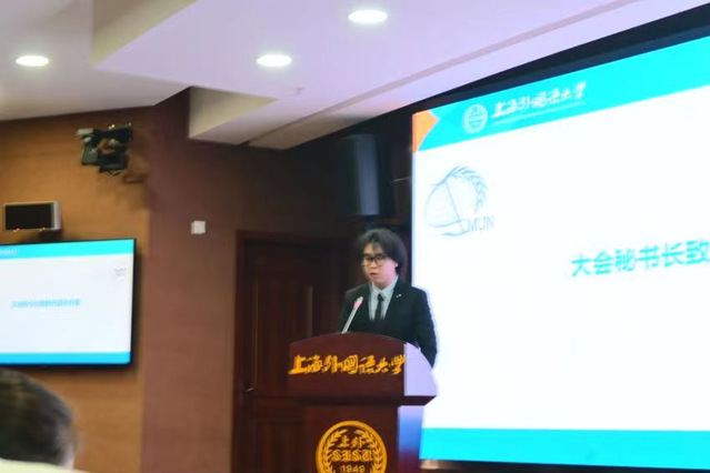 上海外国语大学模拟联合国大会秘书长罗宇轩向各位嘉宾的到来表示诚挚欢迎和感谢,并介绍上海模拟联合国大会的历史。秘书长向各位嘉宾和代表阐述了上外模联协会让世界听见中国青年人的声音,为共同缔造中国青年人的声音而努力的理想,和“学术、责任、远见、真实”的原则。