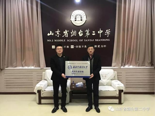 在烟台二中,副校长张仁平、纪委书记陈立新、校长助理教导处主任于志高参加授牌仪式并与上外领导座谈。副校长张仁平介绍了烟台二中悠久的历史以及办学特色,表达了希望输送更多学生到上海外国语大学深造的愿望。