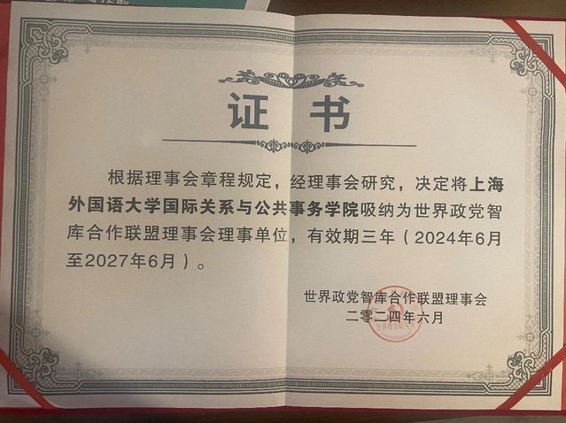 上外国际关系与公共事务学院被吸纳为世界政党智库合作联盟理事会理事单位,上外各国(政党)议会研究中心秘书长、国关学院政治学系教授陈金英受郭树勇院长委托赴北京参加联盟成立大会,领取证书,并参加了世界政党政治学术研讨会。未来,学院将充分借助世界政党智库合作联盟的平台优势,加强和中联部等相关部门的合作,在政党政治的比较研究领域深耕细作,为深化中外政党治国理政的理论和实践贡献上外国际关系与公共事务学院的智慧。